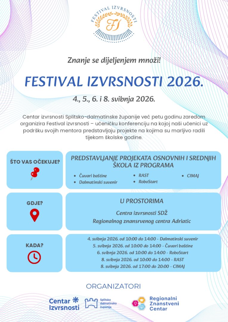 S ponosom objavljujemo da naši učenici sudjeluju na ovogodišnjem Festivalu izvrsnosti u Splitu, gdje će predstaviti svoj rad u sklopu programa CIMAJ i RAST.